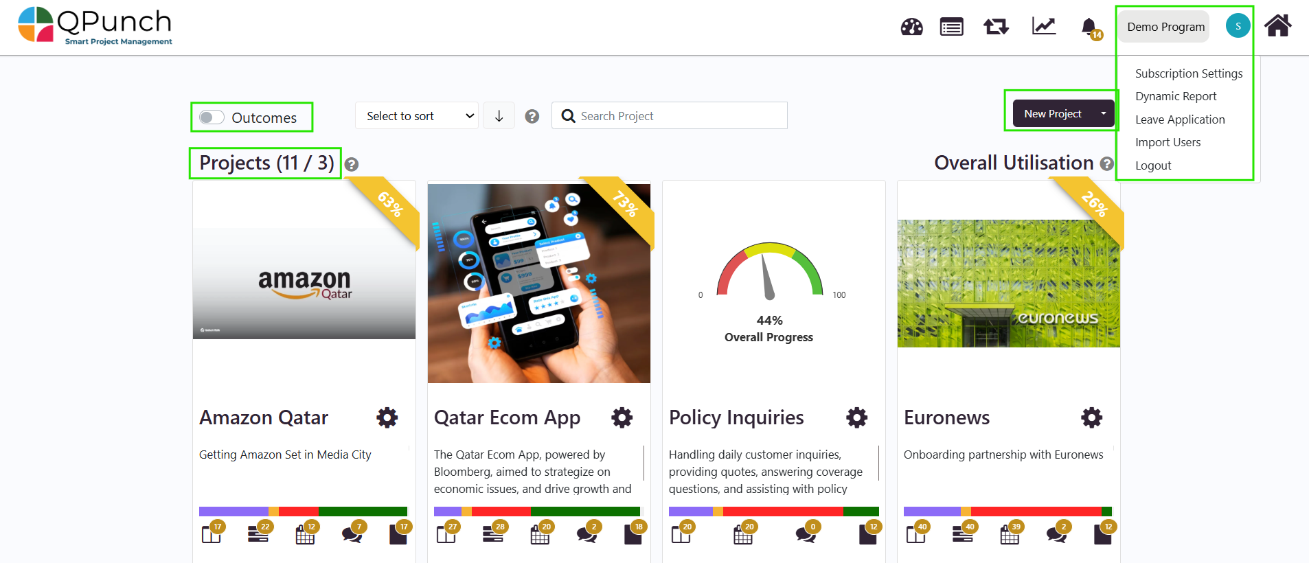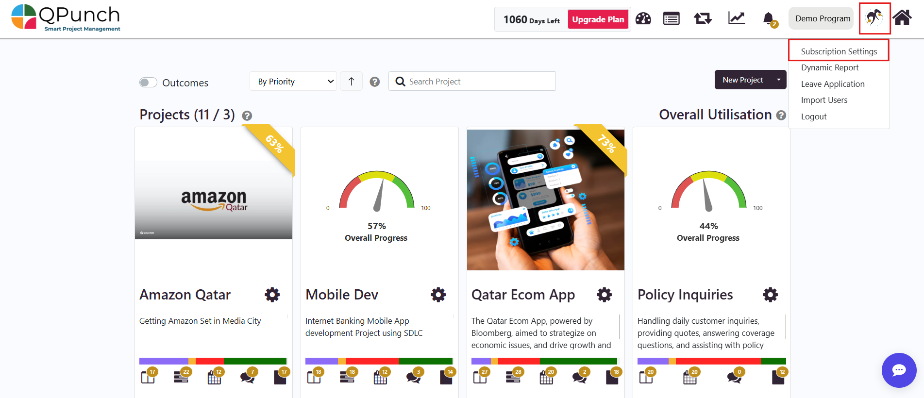 • The image below illustrates the Sub Admin view within the Demo Program subscription. Sub Admins have visibility across all projects, can create new projects, and have access similar to a subscription owner. The only exception is the Upgrade Plan setting, which is visible exclusively to subscription owners.