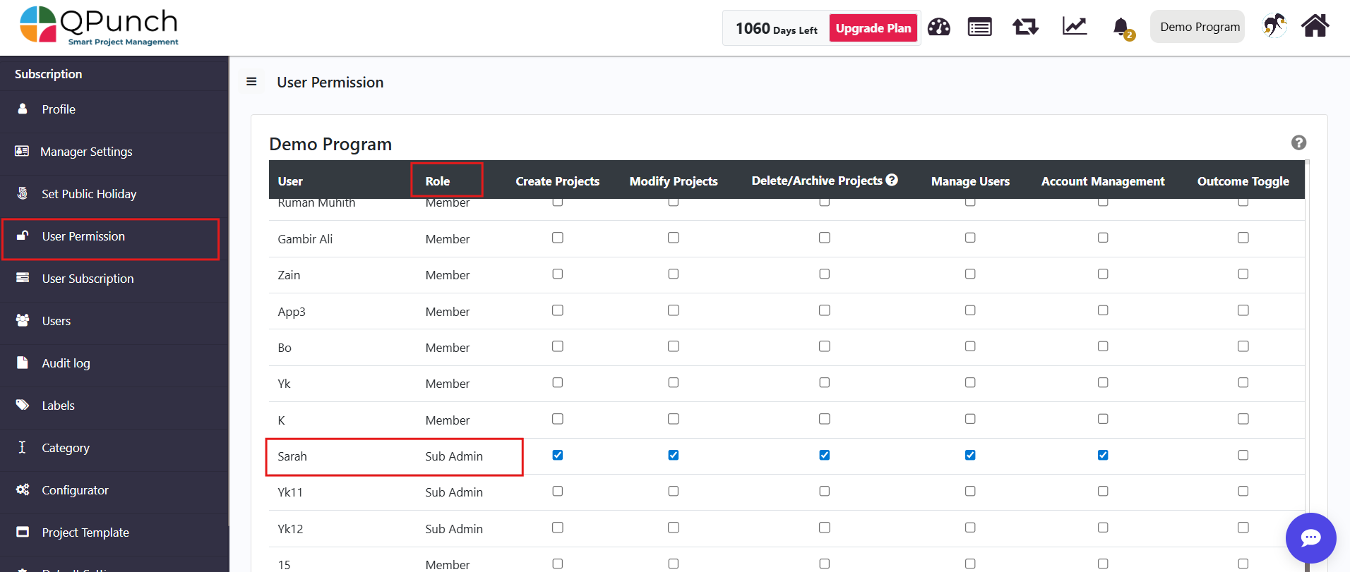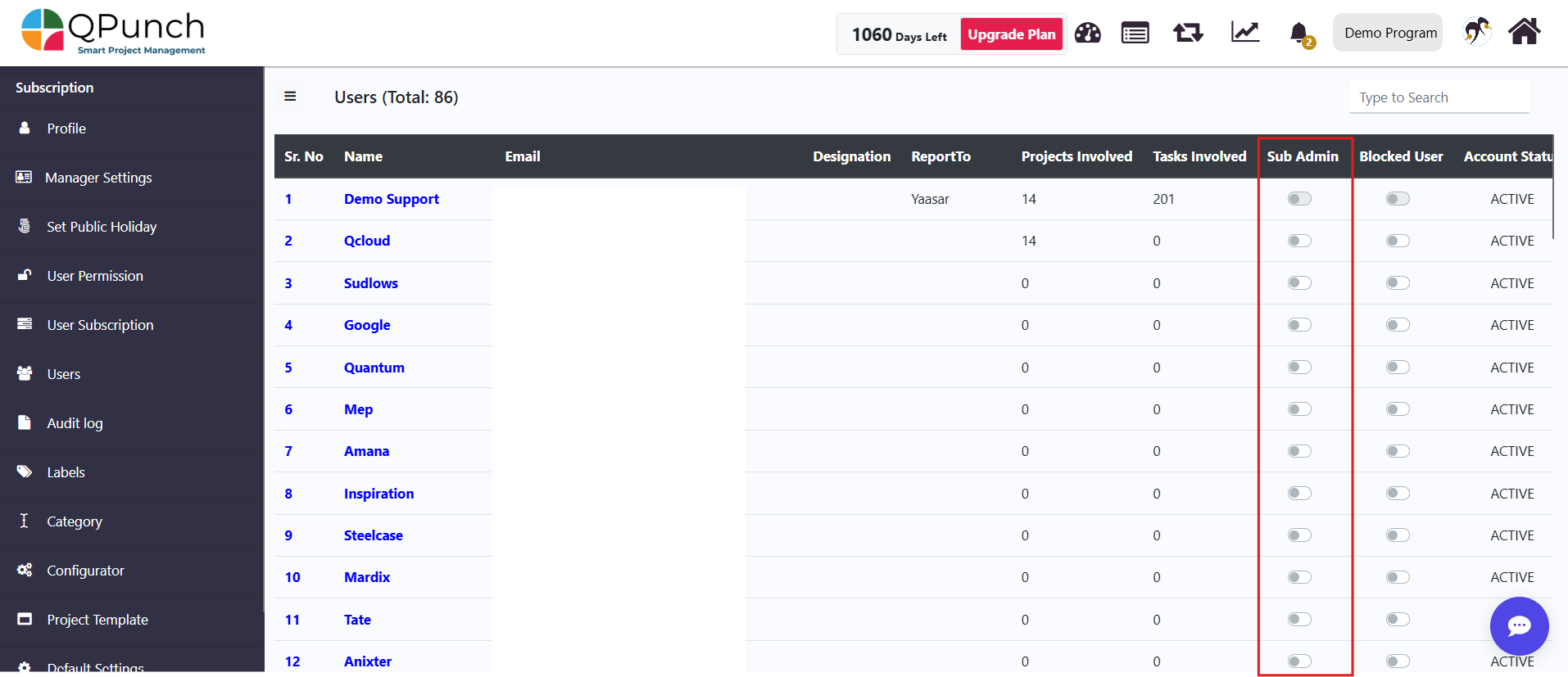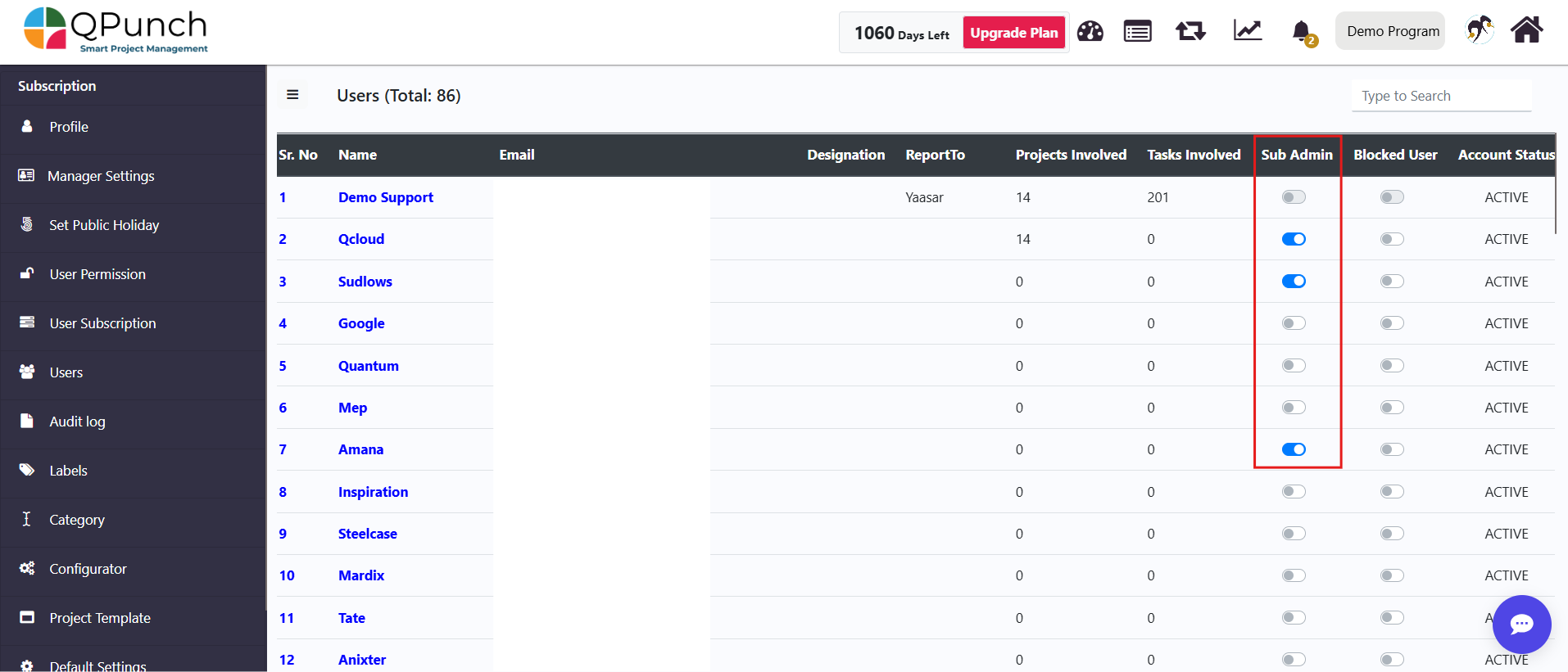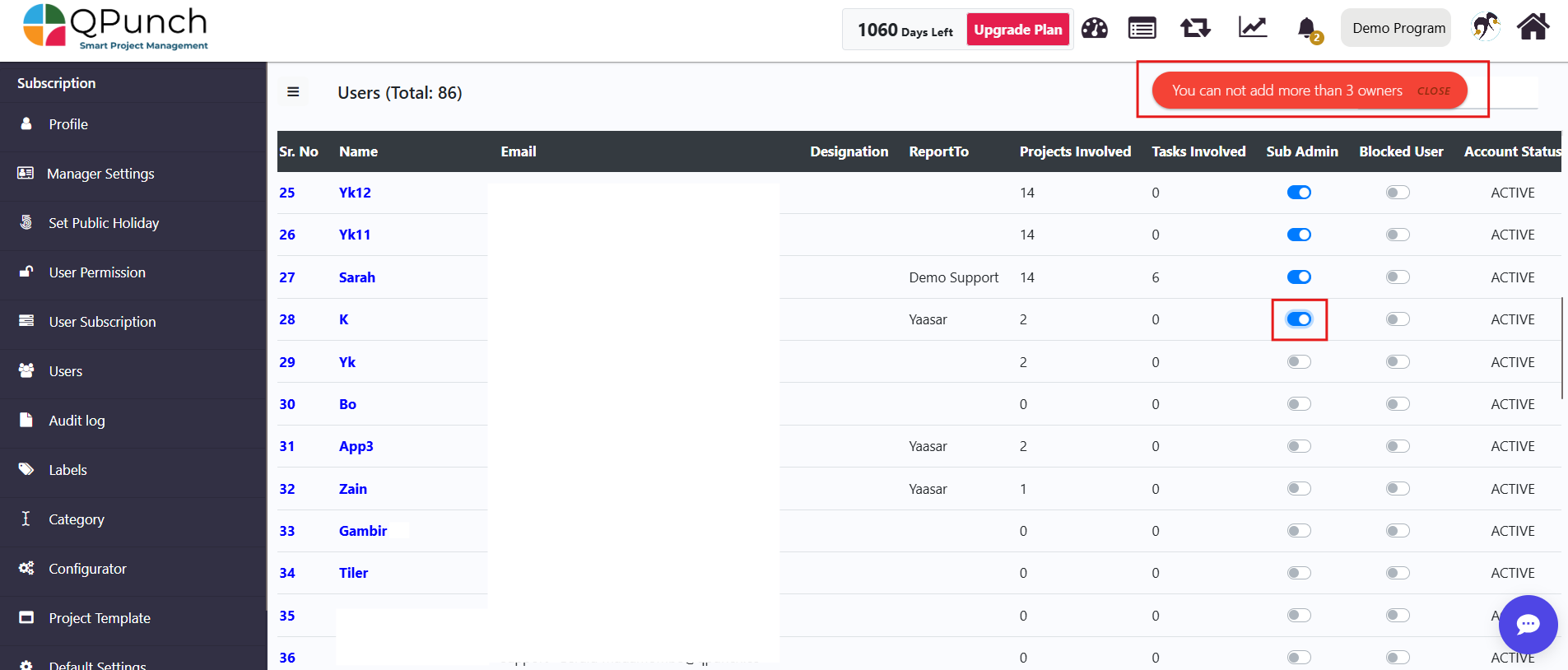 QPunch allows subscription owners to delegate administrative responsibilities by assigning Sub Admin roles to selected users within a subscription. This setup enables multiple users to manage subscription-level settings while maintaining controlled access. This documentation helps you understand how to configure Sub Admin settings and assign up to three users with administrative access in QPunch Smart Project Management Tool.