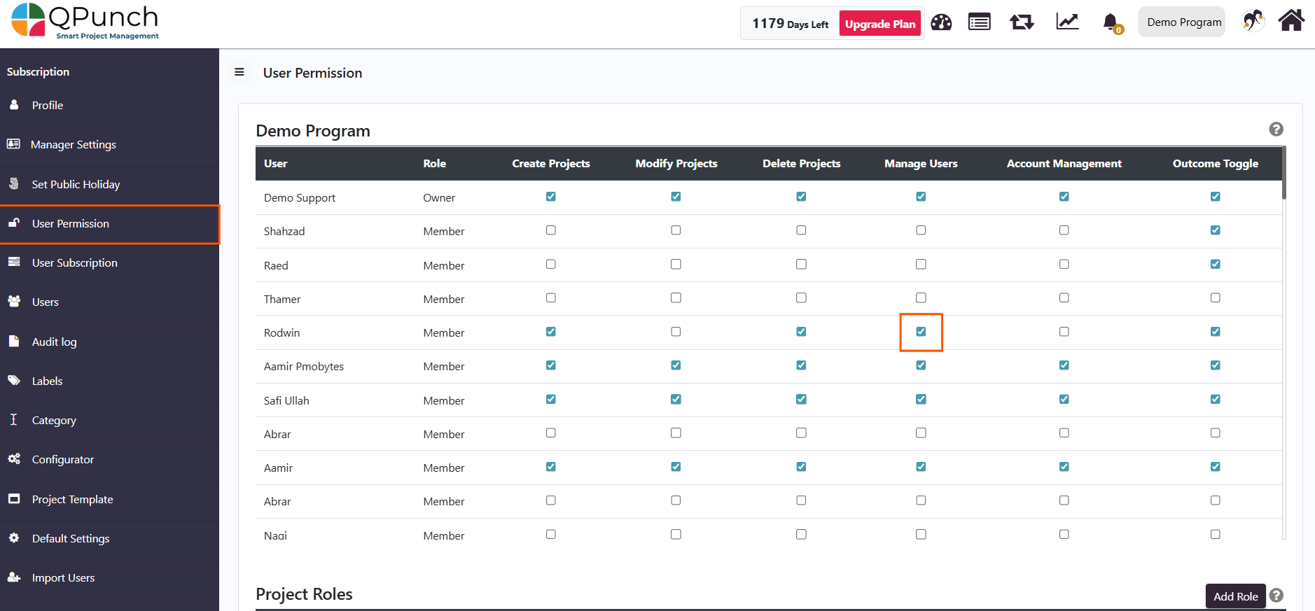 QPunch lets you provide various authorizations to users that enables them to perform specific actions on the project. This documentation helps you understand how to set various user permissions in QPunch Smart Project Management Tool.