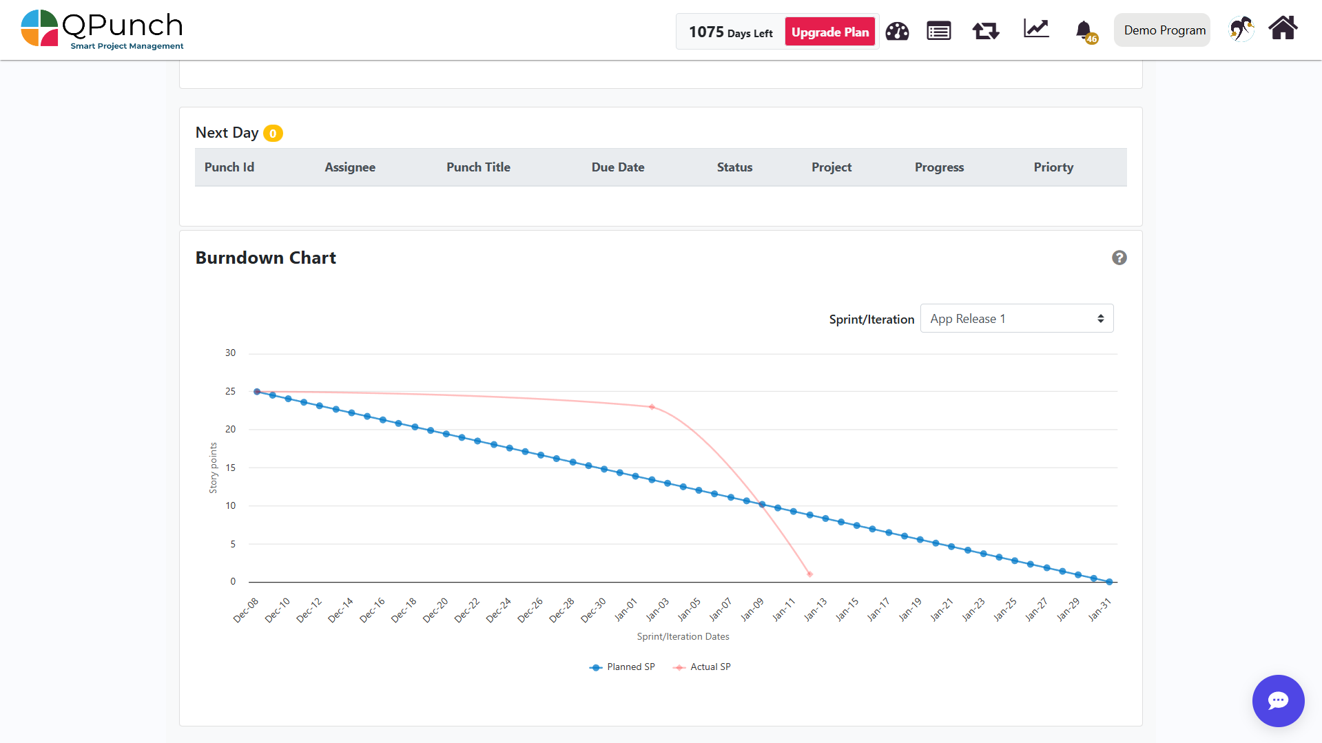 In Agile projects, work is estimated using story points to reflect effort and complexity which QPunch tracks through burndown charts, showing how story points are completed over time and helping teams monitor sprint health and risks early.